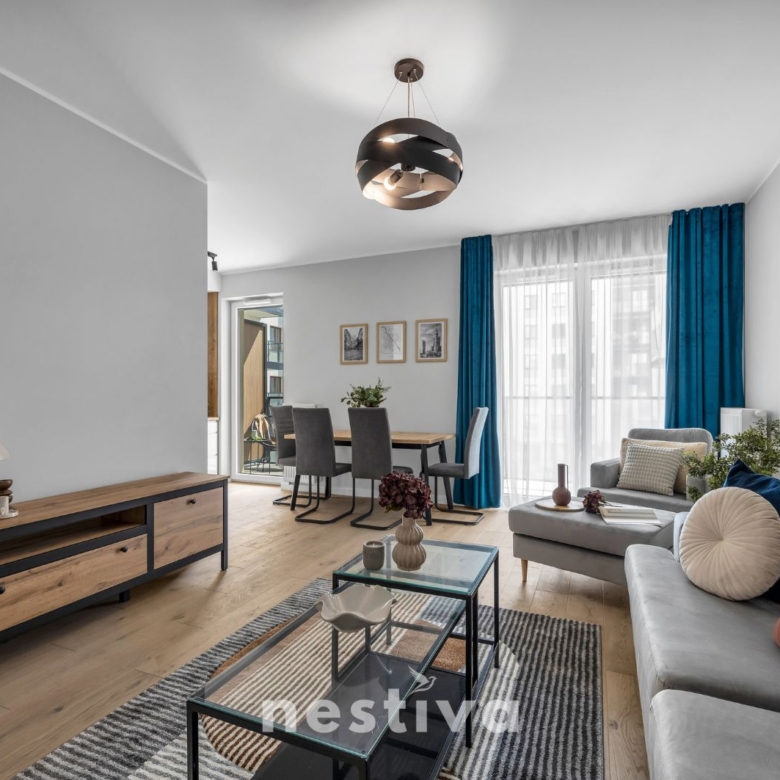 Mieszkanie jest starannie wykończone wysokiej jakości materiałami i wyposażone w niezbędny sprzęt AGD. Cały apartament możemy podzielić na 2 części: pierwszą – dzienną, składającą się z widnego salonu połączonego z funkcjonalną i w pełni wyposażoną kuchnią oraz tarasu oraz drugą część -nocną/sypialnianą, w skład której wchodzą 3 odrębne sypialnie (w tym jedna z prywatną łazienką z prysznicem), niezależna łazienka oraz toaleta.